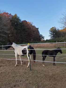 Pearl is our other good riding horse. She's also our most elderly horse with an estimated age now of about 15 years old or older. Pearl also gave us one filly in the autumn of 2020, a solid black Tennessee Walking Horse with a white diamond on her forehead named HF Pearl's Pearly-Dewdrops' Drops ("Dewps"). That filly began our farm's pattern of naming foals after songs by obscure bands that we enjoy.