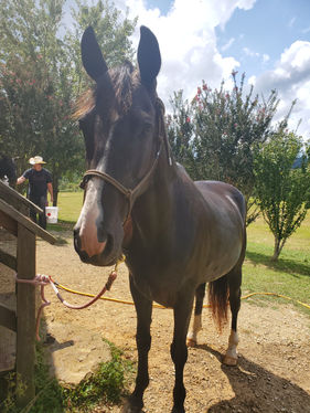 Poison is able to be ridden, but he's the least comfortable ride on our farm. Unknown to us at the time of purchase, he has a condition called stringhalt. He has a little bit of a pop in both of his back legs when he walks. We've conferred with several veterinarians about this and the consensus is that there is such a high chance of corrective surgery making him permanently lame, we just decided to keep him as a pasture pet as is, and he hasn't been ridden in several years. The condition doesn't hurt him. He just looks odd when walking slowly. At a canter or gallop, you can't tell he has issues with his legs. Key to ongoing health is backing exercises and keeping his weight level under control.