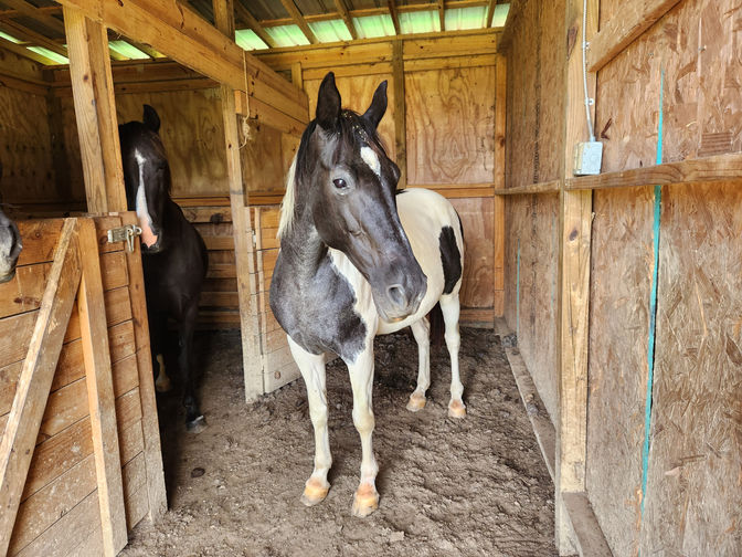 Pearl is our other good riding horse. She's also our most elderly horse with an estimated age now of about 15 years old or older. Pearl also gave us one filly in the autumn of 2020, a solid black Tennessee Walking Horse with a white diamond on her forehead named HF Pearl's Pearly-Dewdrops' Drops ("Dewps"). That filly began our farm's pattern of naming foals after songs by obscure bands that we enjoy.