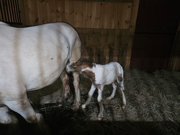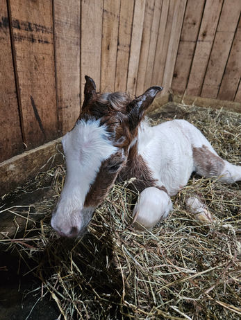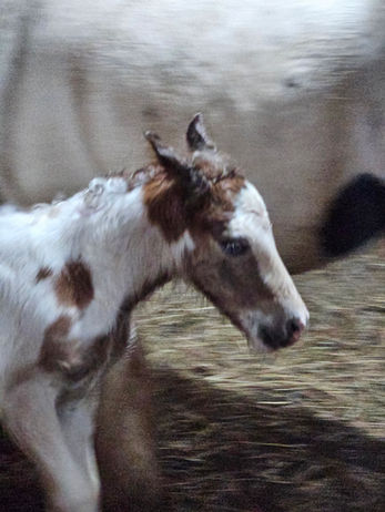 Millie was the third of our six foals born in April and May of 2024. She was born to one of our favorite little piebald mares, Lucky Acres Princess Dawn. Millie was Princess’s eighth straight foal in eight consecutive years, and we are now expecting Princess’s ninth straight foal for the 2025 foal season.