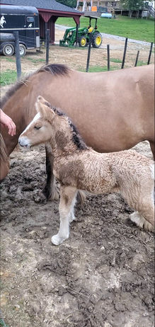 When we purchased Denny’s dam, Bridget, we purchased her in the autumn of 2022 in foal to Denny’s sire, RiverPointe Numero Uno. Having a homozygous dun grulla sire and a heterozygous dun bay dam, we knew that she was absolutely going to be a dun foal, 100% chance. We knew that Bridget was in foal for a birth late in the summer, so we knew that she was going to be heavily pregnant through the hottest part of the Tennessee summer (and thankfully we live up in the mountains, so our temperatures are not usually as bad as the surrounding valleys, but it’s still hot here). We’re slowly moving our foaling season to be in the mid-April to mid-June timeframe as the breeding years march onward, but we still have them staggered this year from early April to late July (with the ones on the outside edges of that timeframe being recent acquisition mares where we had less control over when they were bred).